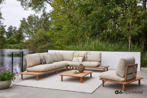 RELAXTE SFEER Deze teakhouten Sling module loungeset ademt een relaxte sfeer. Dit dankt hij aan de unieke vormgeving van de kussens en de banden di...