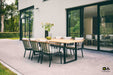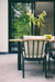 De Condor dining kenmerkt zich door een strakke, stoere uitstraling, die zowel in de stoel als in het tafelonderstel is doorgevoerd. De basis van de set bestaat uit matzwart gepoedercoat aluminium, uitgevoerd in stevige, robuuste vormen. De BEE WETT® kussens hebben een grove weefstructuur met een zachte touch, wat zorgt voor optimaal zitcomfort. In combinatie met de elegante rondingen in de rug van de stoel en het gebruik van naturel teakhout in zowel het tafelblad als de armleuningen, krijgt de Condor een warme, natuurlijke uitstraling mee.