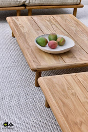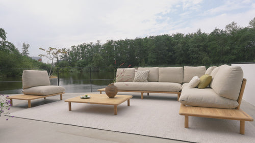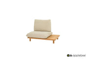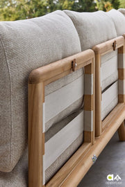 Deze teakhouten Sling module loungeset ademt een relaxte sfeer. Dit dankt hij aan de unieke vormgeving van de kussens en de banden die de kussens dragen, en aan de royale afmetingen van de modules. Een leuk detail is de knoop in het teakframe waarmee het rugkussen stevig op zijn plaats wordt gehouden.